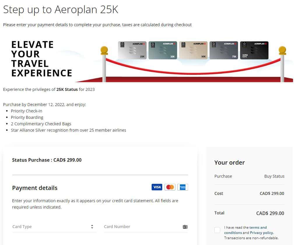 In regard to the 25K status buy-up offer for $299 (CAD), keep in mind that you’ll receive a two free checked bags on all Air Canada flights, priority airport services, and up to 25 eUpgrades, amongst other perks.