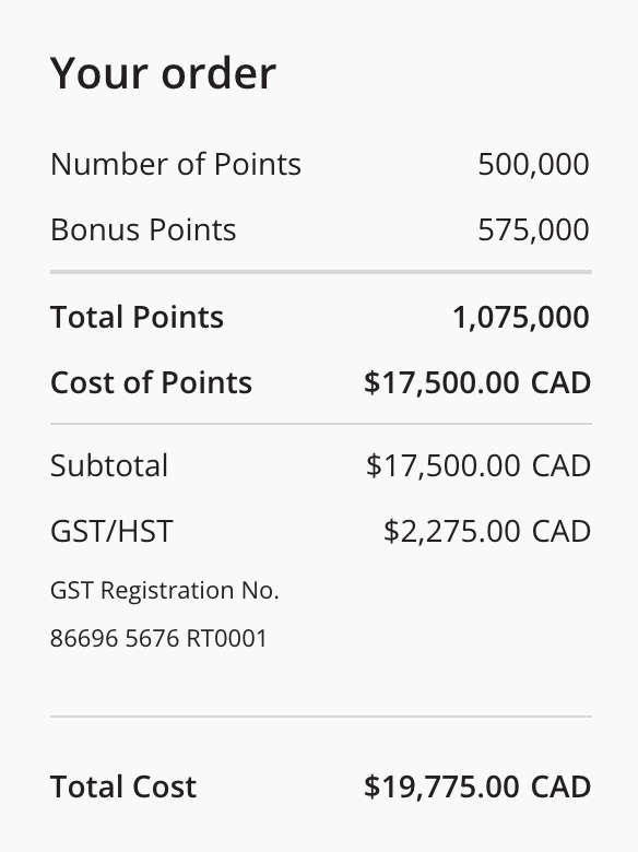 Note that buying or gifting Aeroplan points with a Canadian credit card will result in GST/HST being added to the total, which would erode the value of your purchase.