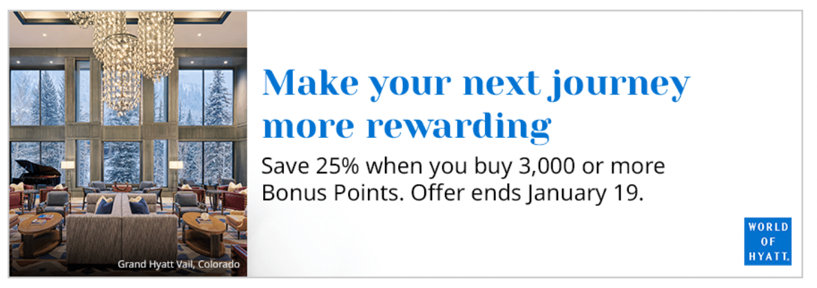 World of Hyatt is offering a discount on points purchases until January 19, 2023. You’ll get a 25% discount when you buy at least 3,000 points.