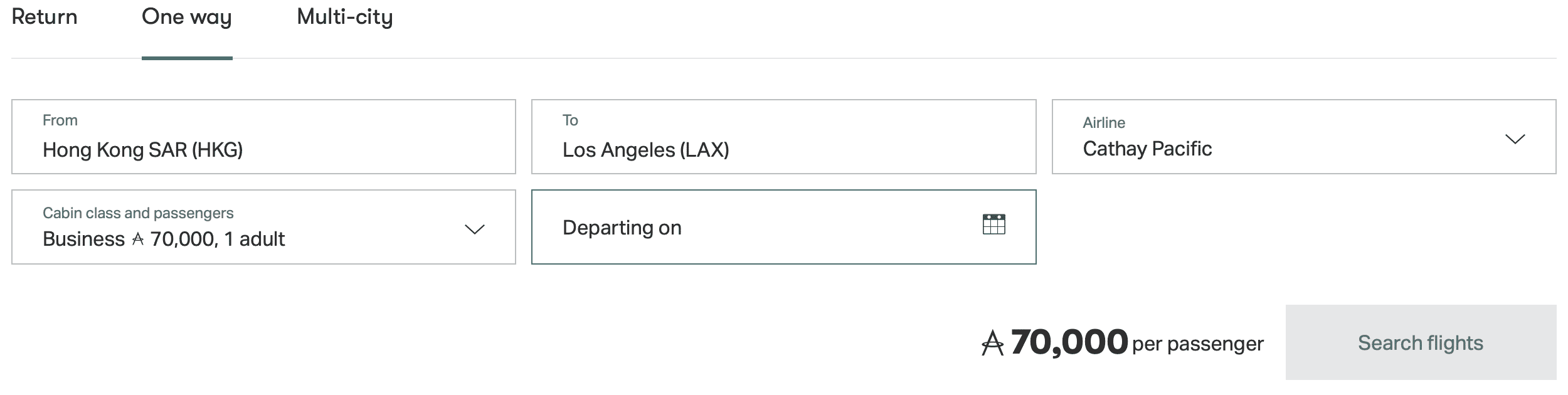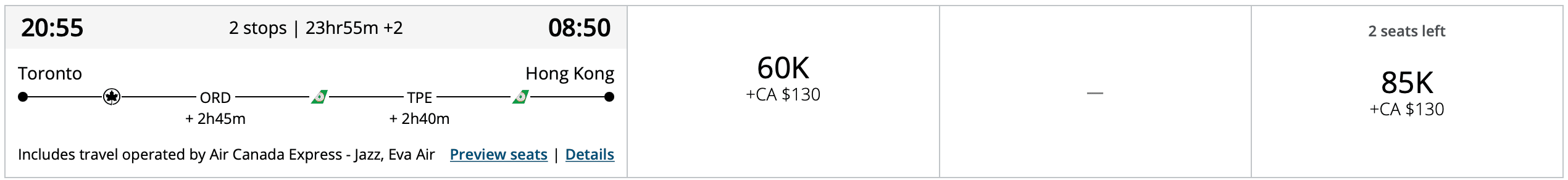 If you can find space, you can expect to pay either 70,000 or 85,000 Asia Miles for a one-way flight in business class between North America and Hong Kong, depending on the airport you’re flying to.