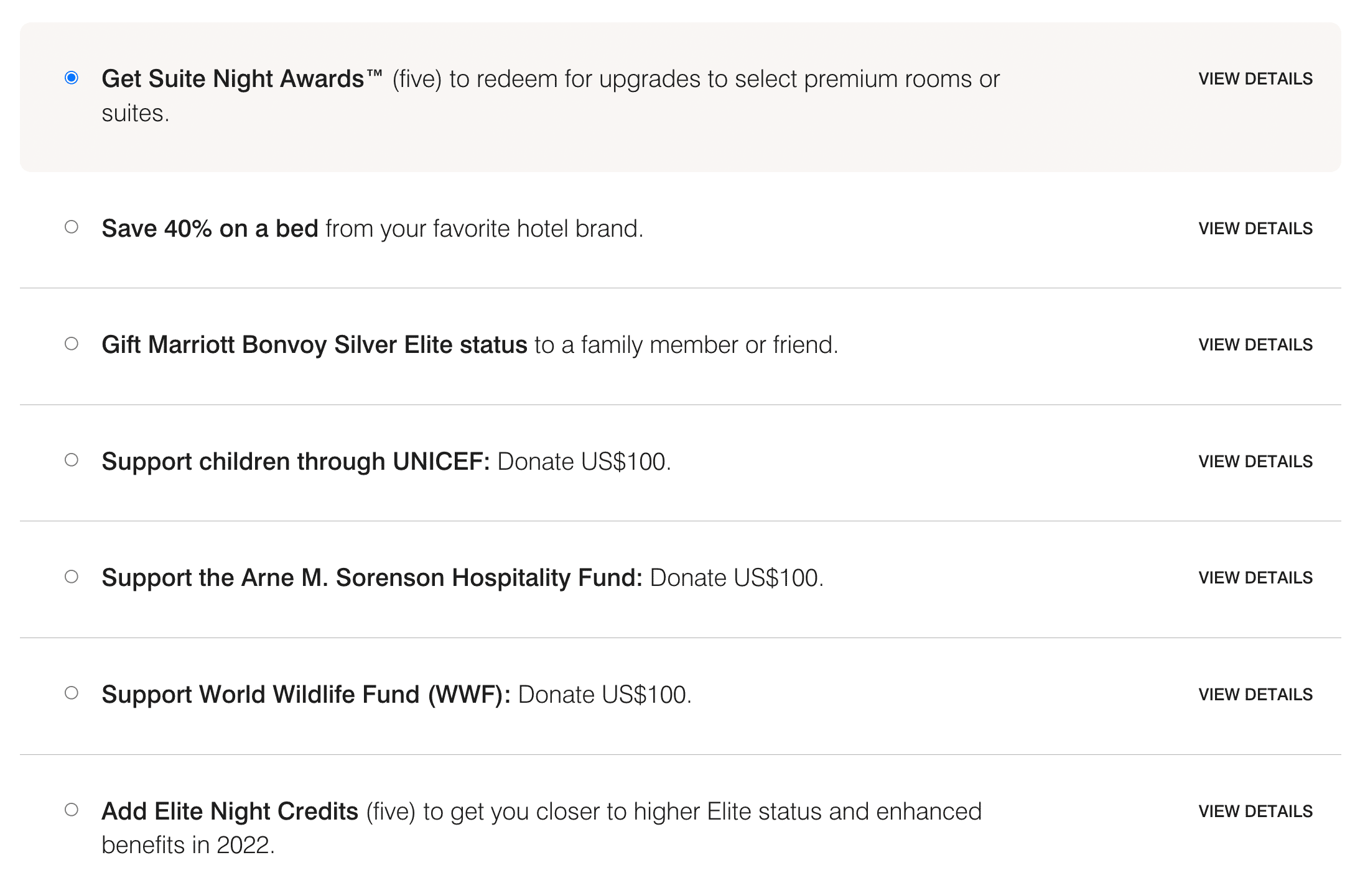 The selection period for Marriott Bonvoy‘s 2022 Annual Choice Benefits ends on January 7, 2023. If you’ve reached 50 or 75 elite qualifying nights last year, go ahead and make your selection now if you haven’t already.