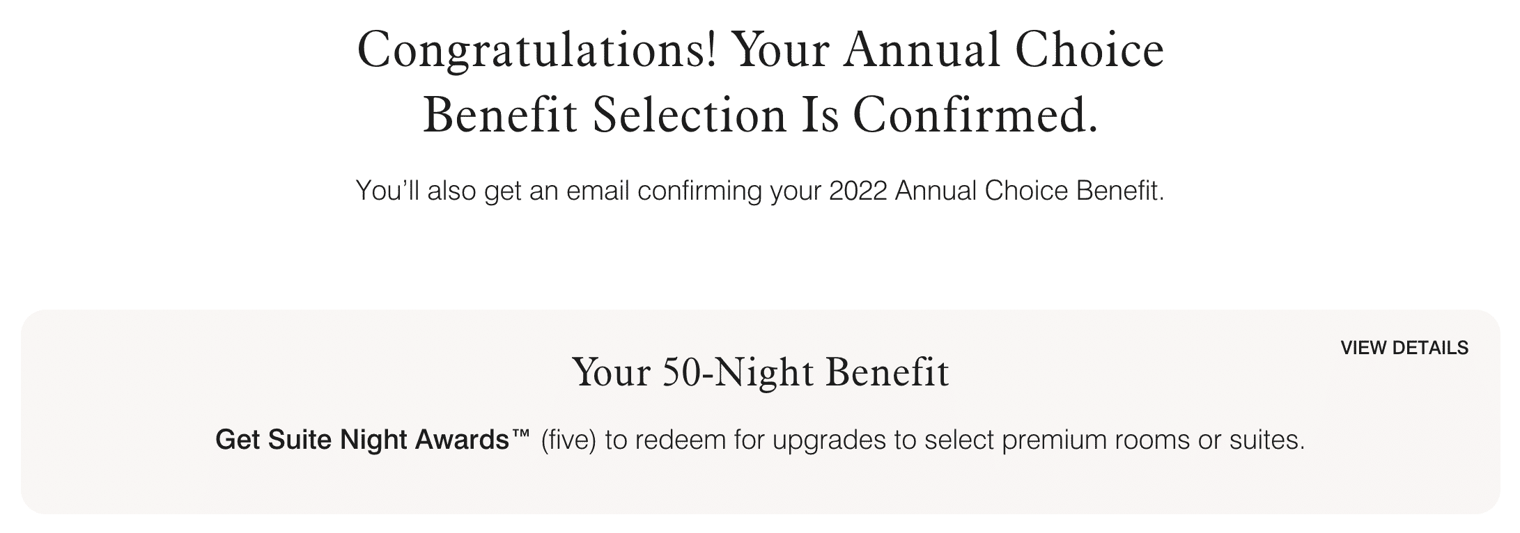 If you haven’t made your selection by January 7, you’ll receive the set of five Suite Night Awards as a default benefit for both the 50- and 75-night Choice Benefits.