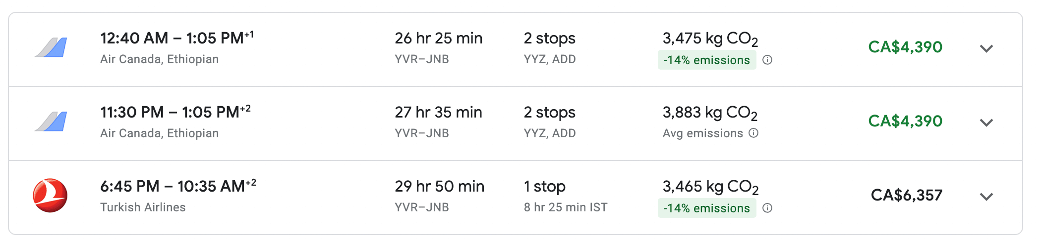A one-way business class ticket from Canada to South Africa can easily run you upwards of $4,000 (CAD); alternatively, you can take advantage of Alaska’s sweet spot with Cathay Pacific by buying 62,500 Alaska miles and using those miles to book Cathay Pacific business class to Johannesburg with a free stopover in Hong Kong.