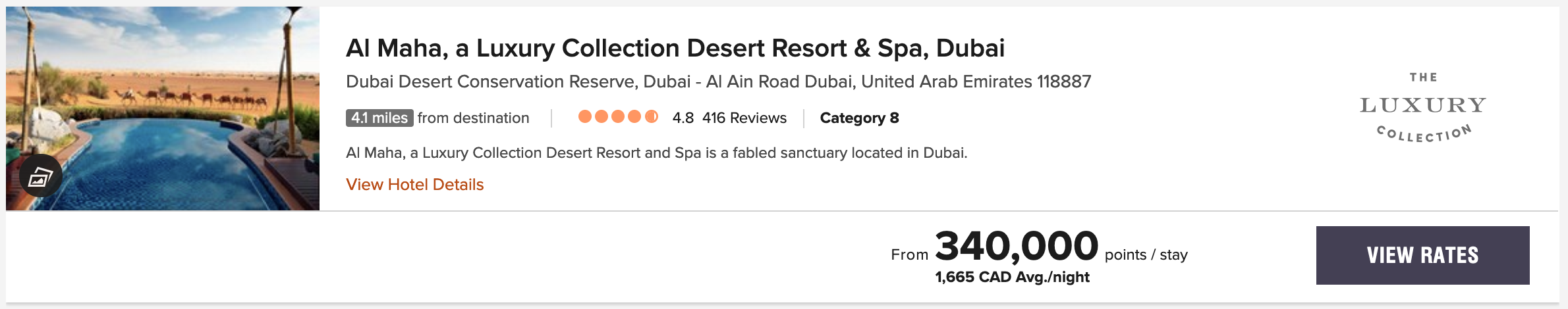 The best of the best go for 80,000–150,000+ points per night. Compare that to the cash price at the Luxury Collection’s Al Maha Desert Resort Dubai, which can easily exceed $1,600 (CAD) per night!