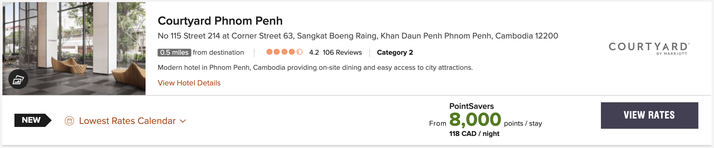 For example, at the lower end, the Courtyard Phnom Penh offers better value on points that with cash. You can find dates under 10,000 points per night at the PointSavers rate. Against a nightly cash price of $118, an 8,000-point booking is a value of 1.5 cents per point (CAD).