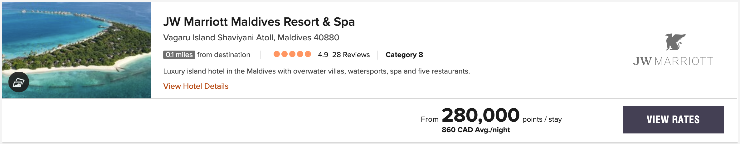 Or if the desert isn’t your style, you could indulge in decadence at the JW Marriott Maldives. Even with “relatively” more reasonable prices under $1,000 (CAD) per night, a points booking is still the way to go.