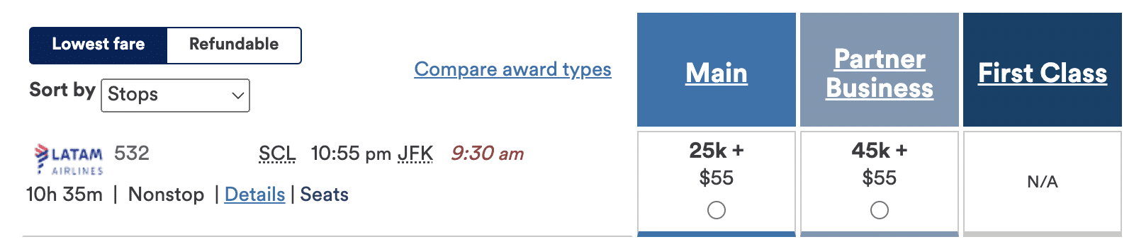 Compared to before, when award availability was difficult to come by, you should now be able to find award flights at a reasonable cost. For example, you can fly from Santiago to New York with LATAM in business class for 45,000 miles plus minimal taxes and fees.