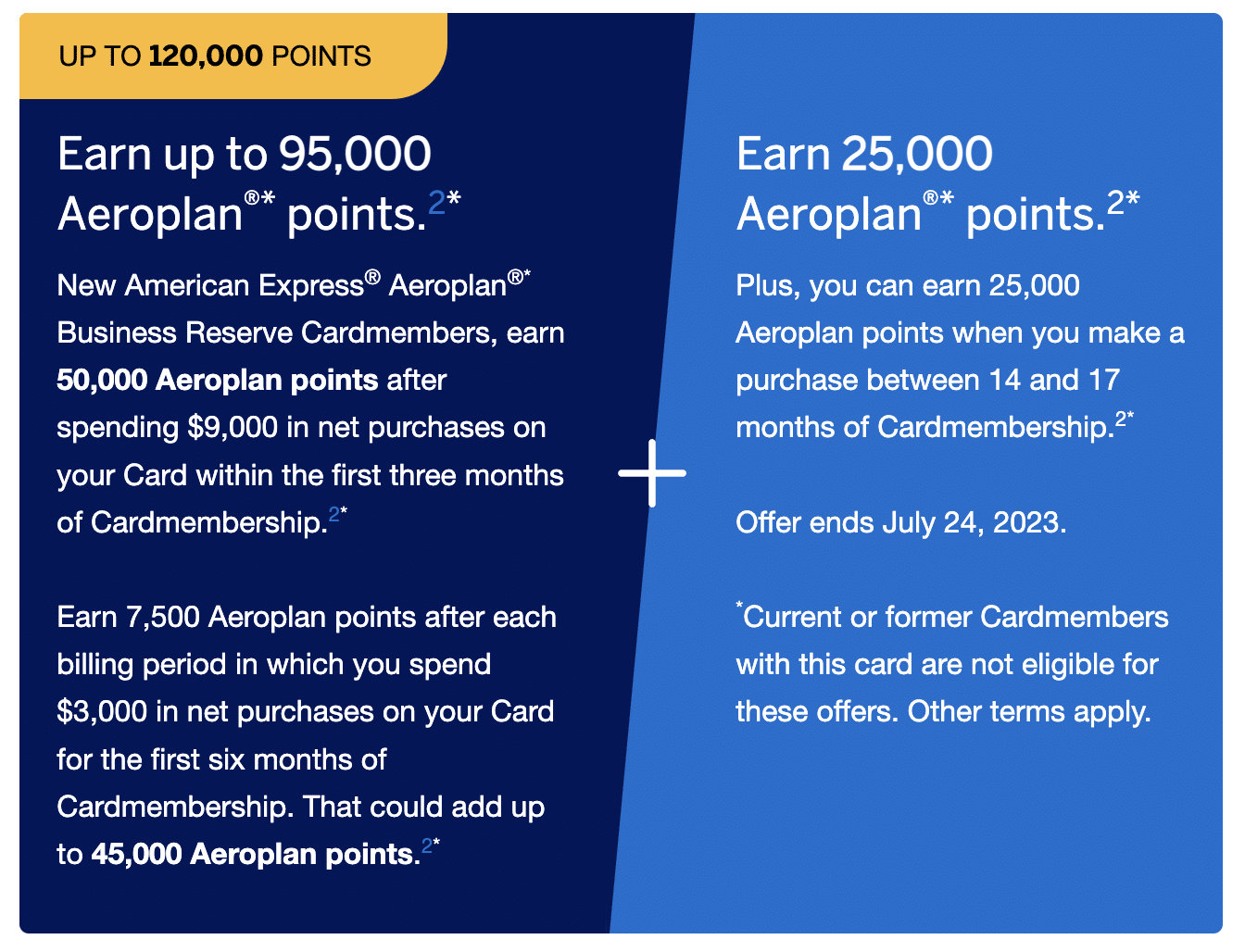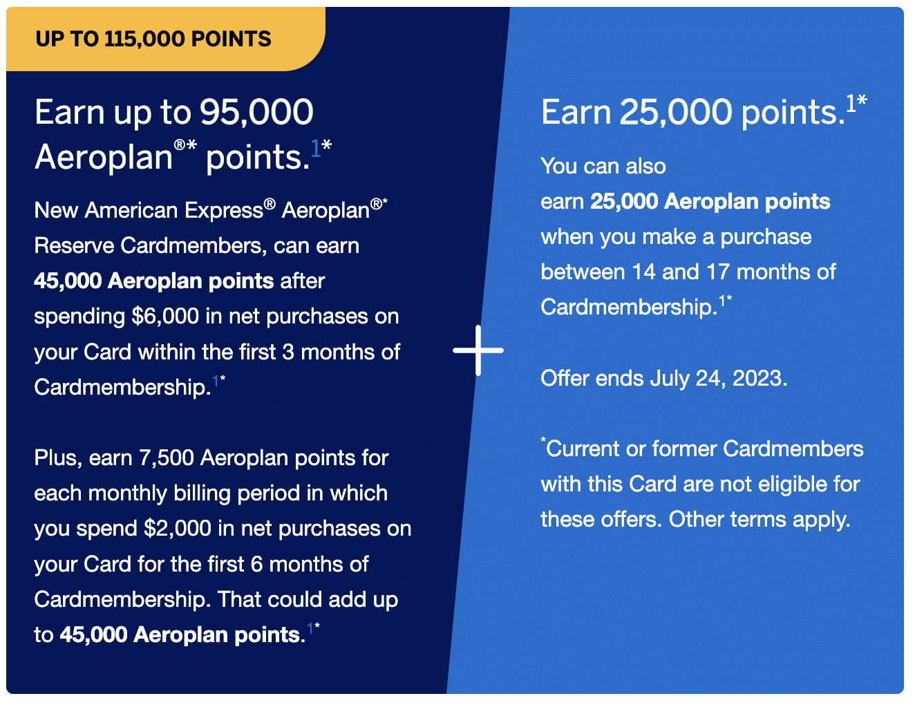 Echoing the thrilling all-time-high bonuses we saw in the summer of 2021, you have until July 24, 2023 to snag the new generous offers on the Aeroplan Reserve Card and the Aeroplan Business Reserve Card, worth up to 115,000 and 120,000 Aeroplan points, respectively.