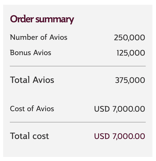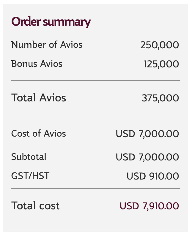 Qatar Airways Privilege Club members can buy up to 250,000 Avios per calendar year without taking into account any bonuses. So, if you were to max out this promotion, you’d end up with 375,000 Avios for $7,000 USD ($9,438 CAD).