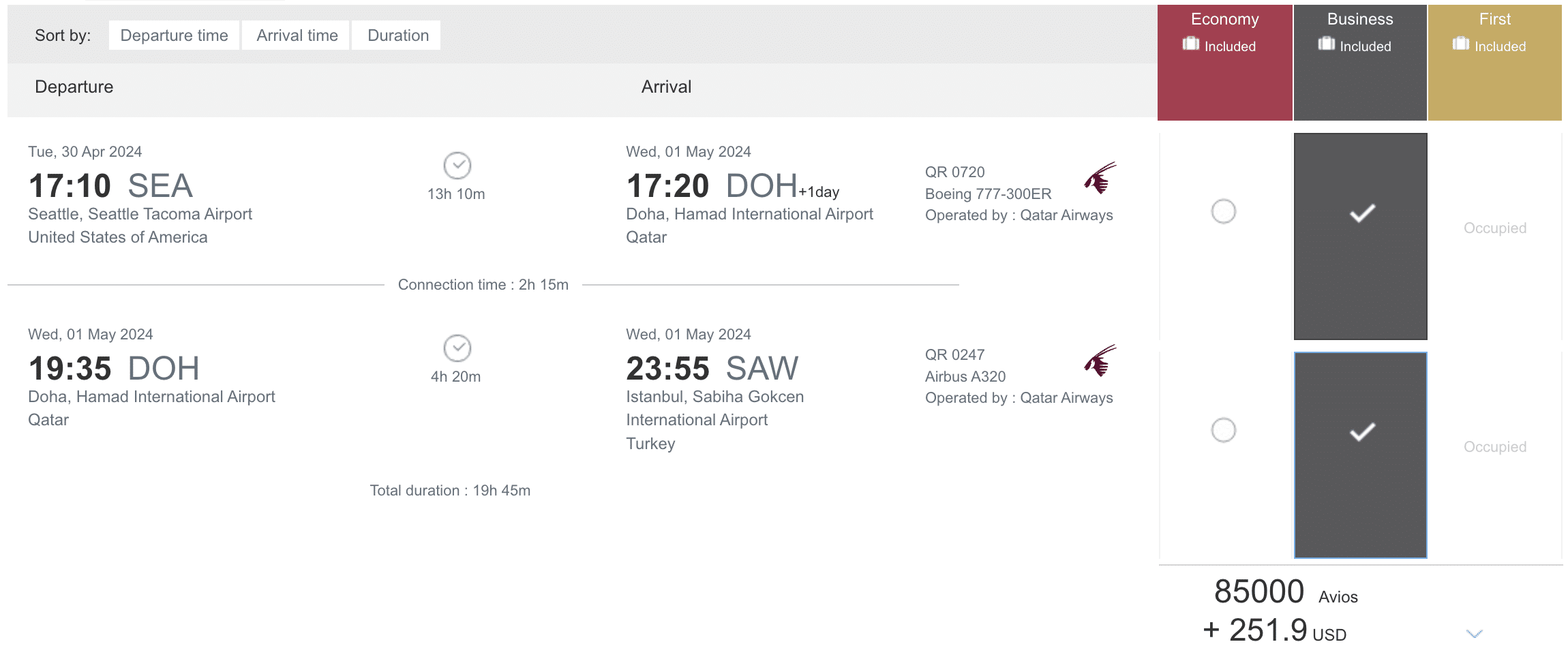 For example, you can fly from Seattle to Istanbul via Doha for 85,000 Avios.