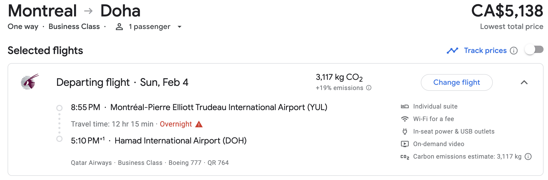 For example, a one-way flight from Montreal to Doha costs 70,000 Avios.
