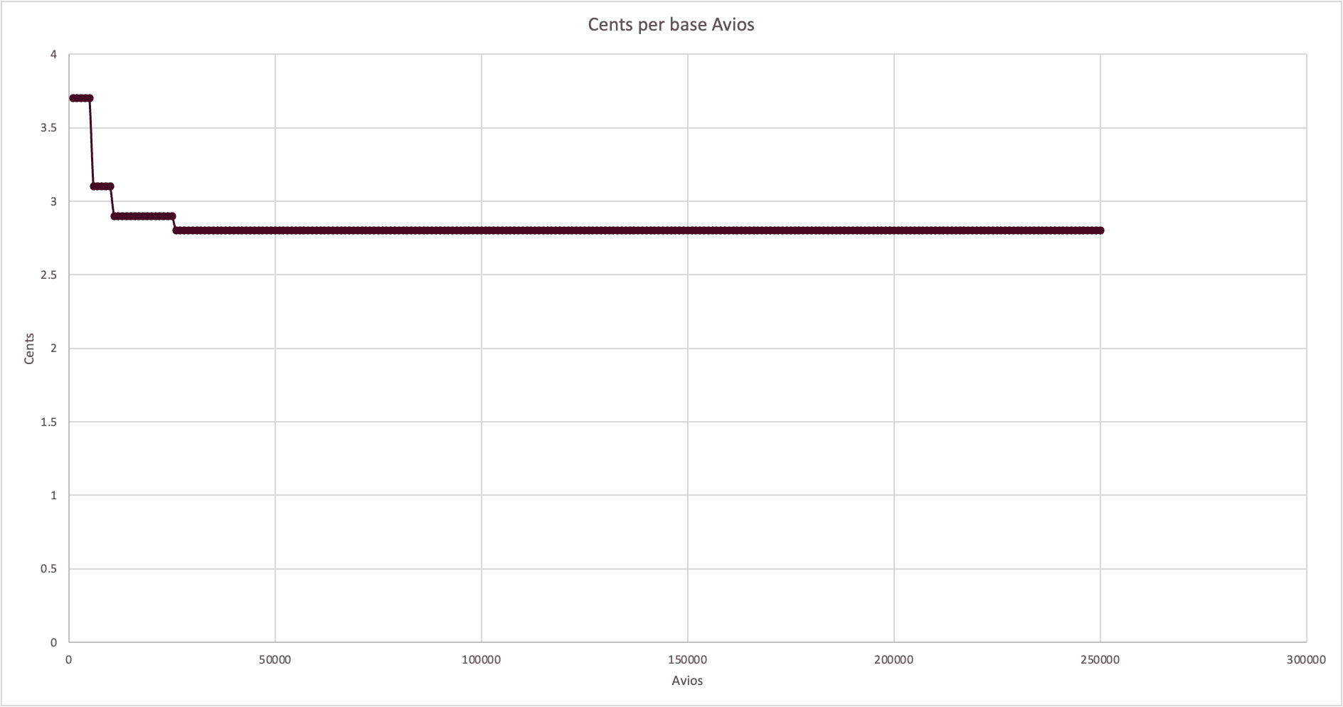 Normally, Qatar Airways sells points with a base price that ranges from 2.8–3.7 US cents per point (cpp), depending on how many Avios you buy. As is the case with purchased British Airways Avios, the price lowers as you buy more points, but flattens out after around 25,000 points.