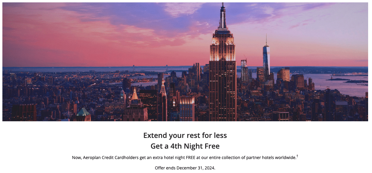 Between now and December 31, 2024, cardholders of any of Aeroplan’s Canadian- or US-issued co-branded credit cards can enjoy an unlimited Fourth Night Free benefit for all hotel redemptions booked with Aeroplan points.