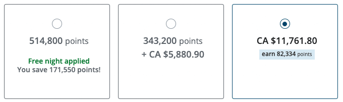 Without the Fourth Night Free benefit, this same stay would cost a total of 754,550 Aeroplan points, yielding a lower value of 1.56 cents per point (CAD).