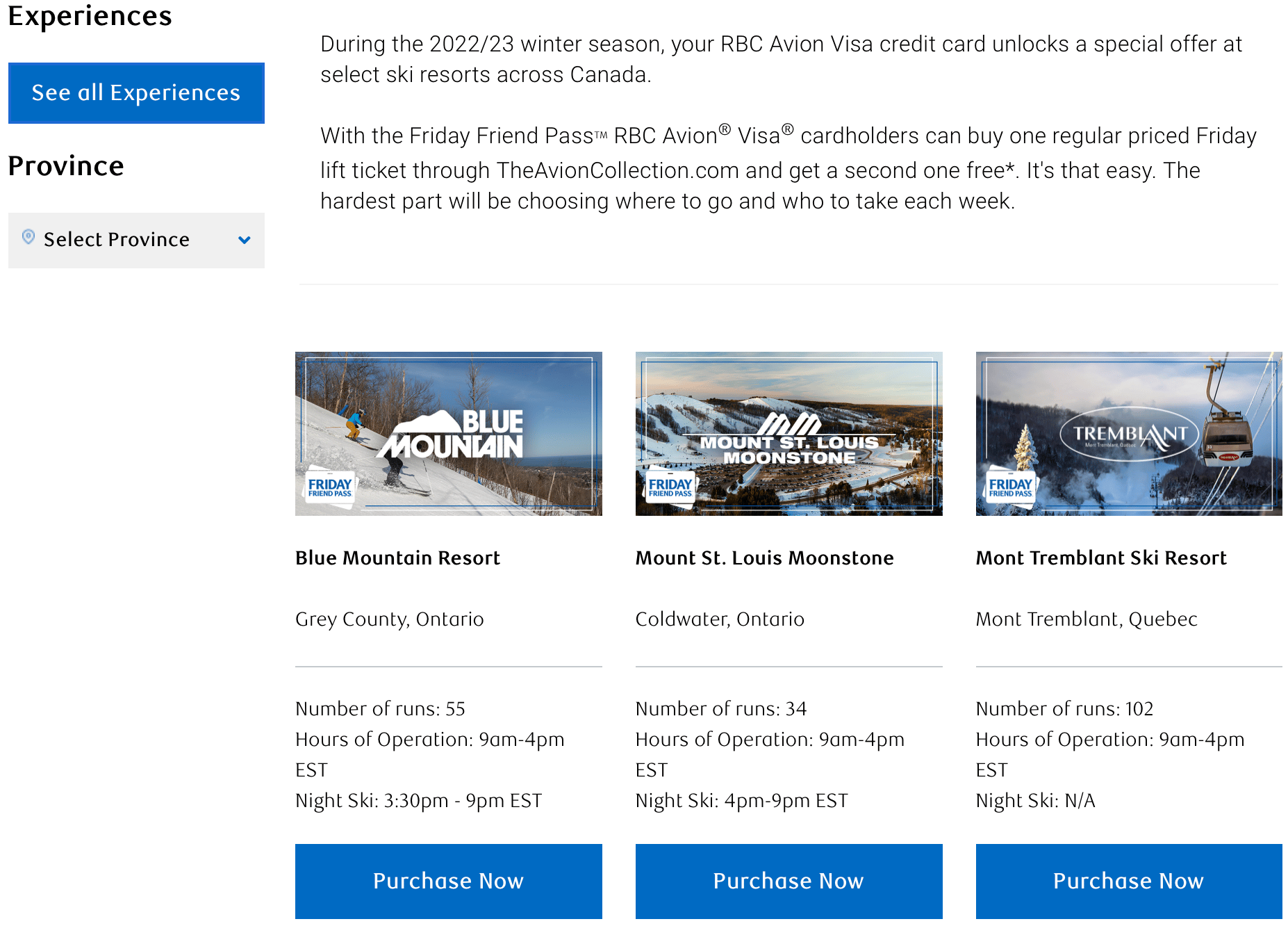 As an example, for the 2022/2023 ski season, RBC Avion Rewards offered a “Buy One, Get One Free” promotion for lift tickets at various ski resorts across Canada, including Blue Mountain, Mont Tremblant, Lake Louise, and more.