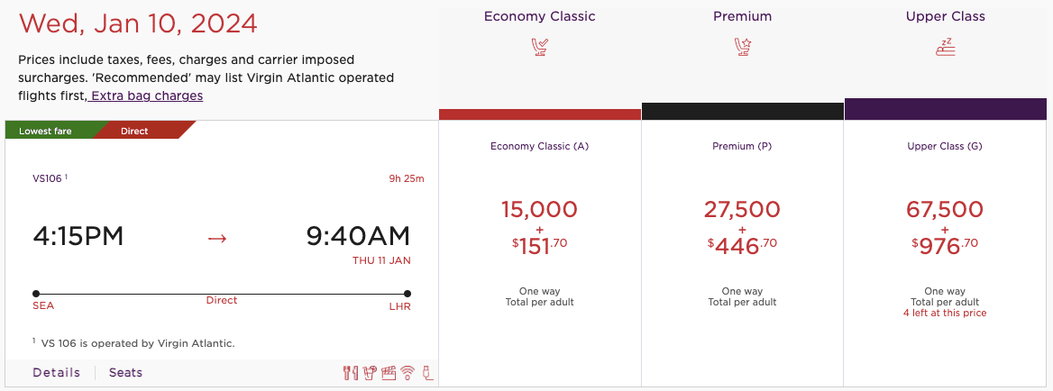 For example, with the current promotion, you can book a Virgin Atlantic flight from Seattle to London for the following amounts of points, with the 25% discount factored in: