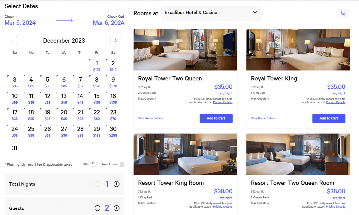 For instance, a night at the Excalibur can be as low as $35 USD (plus $35 in resort fees) on weekdays.